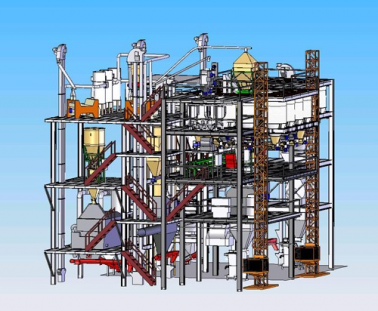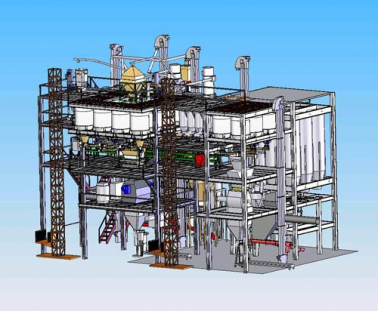 • Технологическое и транспортное оборудование линии компактно размещено на площадках в едином объеме помещения, исключающем влияние перетоков воздуха на работу дозирующего оборудования, характерное для поэтажной компоновки.